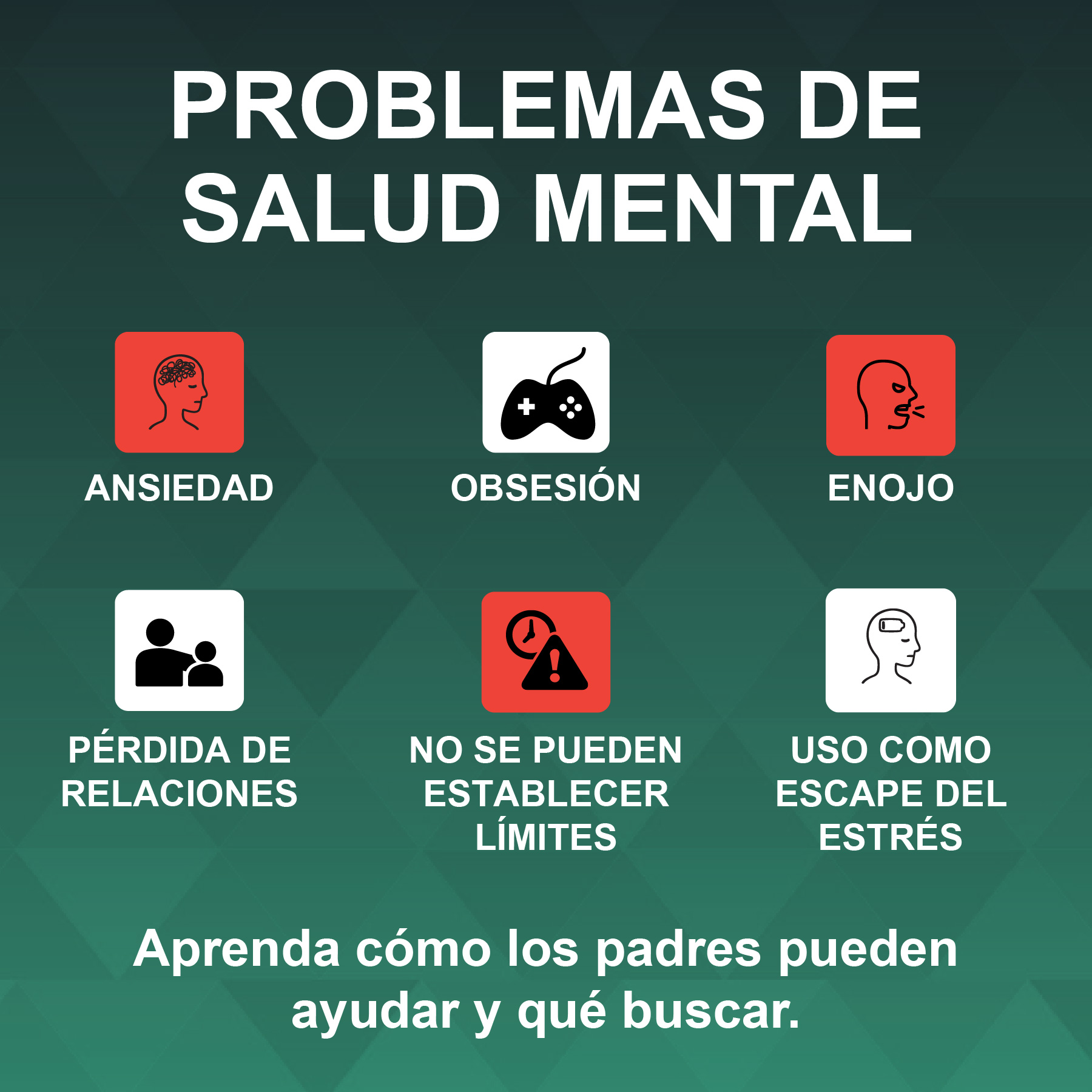 El 8,5 % de los jugadores jóvenes estadounidenses (de 8 a 18 años) son clínicamente adictos a los videojuegos. Los síntomas de la adicción incluyen ansiedad, baja autoestima, depresión, obsesión, incapacidad para establecer límites, pérdida de relaciones, ira y jugar videojuegos para aliviar el estrés. Obtenga más información en estas guías para padres gratuitas.